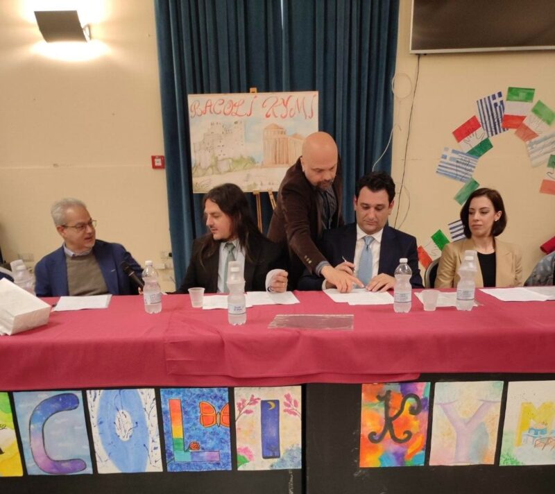 Ο Δήμαρχος του Bacoli, Dr. Josi Gerardo Della Ragione με τον Δήμαρχο Κύμης Αλιβερίου, Νίκο Μπαράκο, τη στιγμή της υπογραφής Συμφώνου Συνεργασίας, κατά την επίσημη εκδήλωση για τα 40 χρόνια από την αδελφοποίηση των δύο πόλεων. Δεξιά η γενική πρόξενος της Ελλάδας στην Ιταλία, κ. Αγγελική Κολοκυθά, η οποία ταξίδεψε από την Ρώμη στο Bacoli ειδικά για την εκδήλωση.